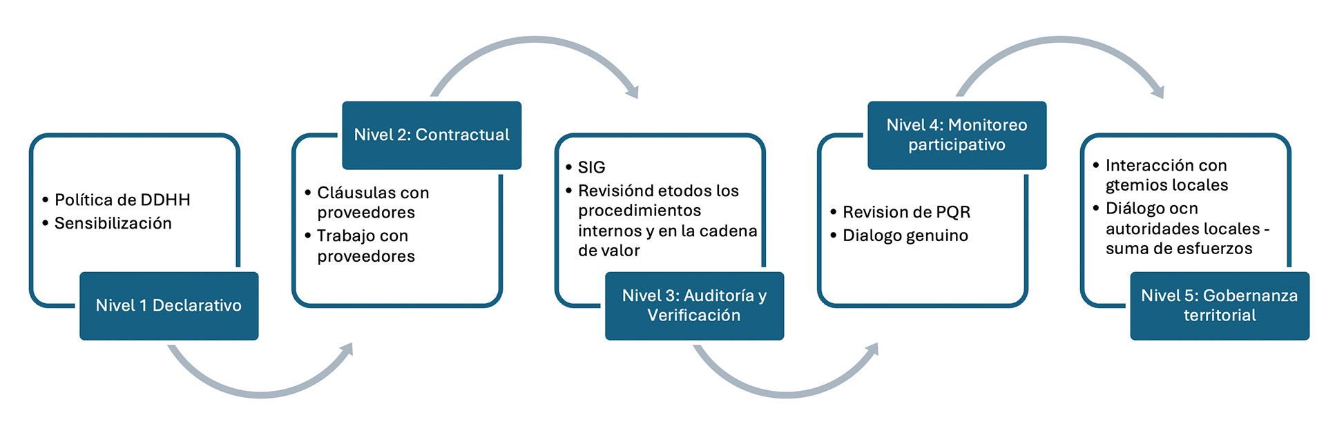 El nivel de madurez se evidencia cuando los riesgos en derechos humanos están plenamente integrados en los sistemas de gestión y cuando el personal comprende cómo sus decisiones operativas pueden afectar el ejercicio de derechos.